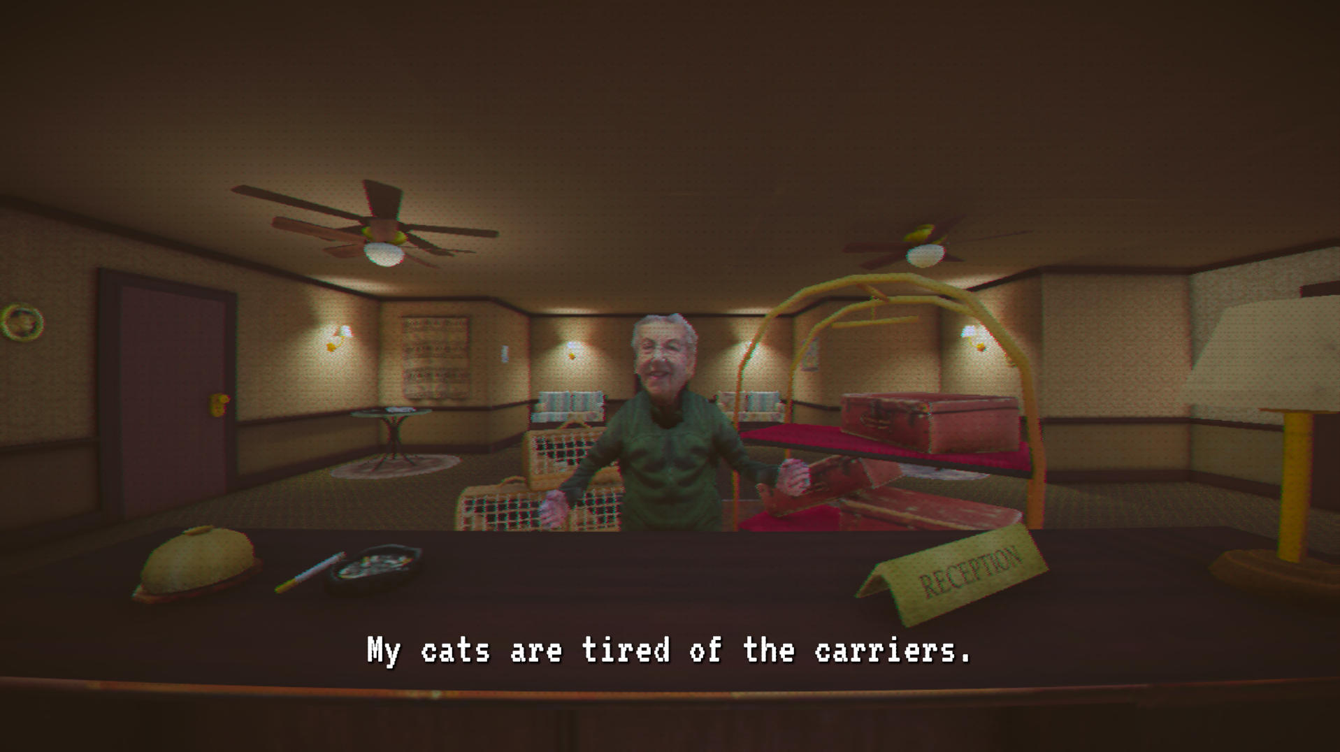 A short exploration game blending serie, liminal-space vibes with a lighthearted, silly tone. Wander, listen for meows, and try not to question the hotel too much.